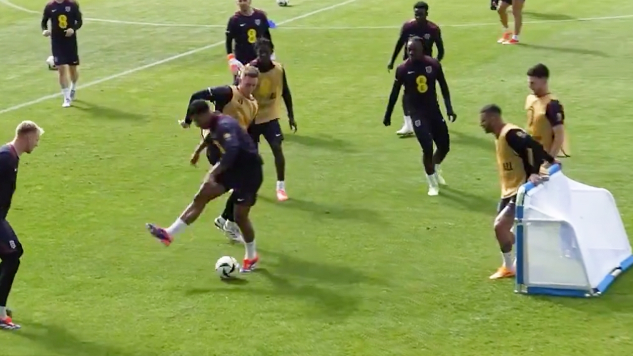"ไคล์ วอล์คเกอร์" ถึงกับเหวอ "เบลลิงแฮม" สตาร์ทีมชาติอังกฤษ โชว์ยิงหลังเท้าใส่ ขณะเตรียมบ...